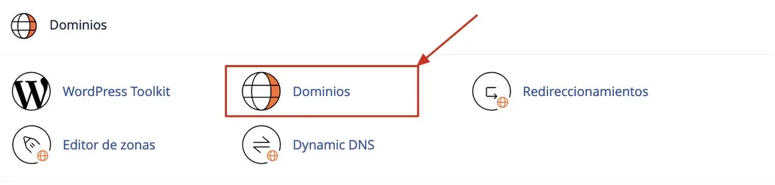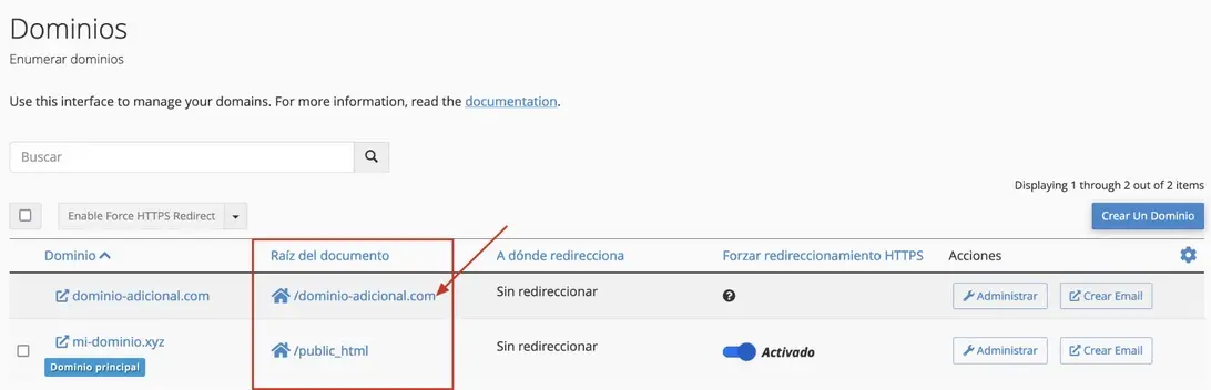 • Para confirmar el directorio raíz en dominios adicionales, debemos ubicar la sección Dominios: