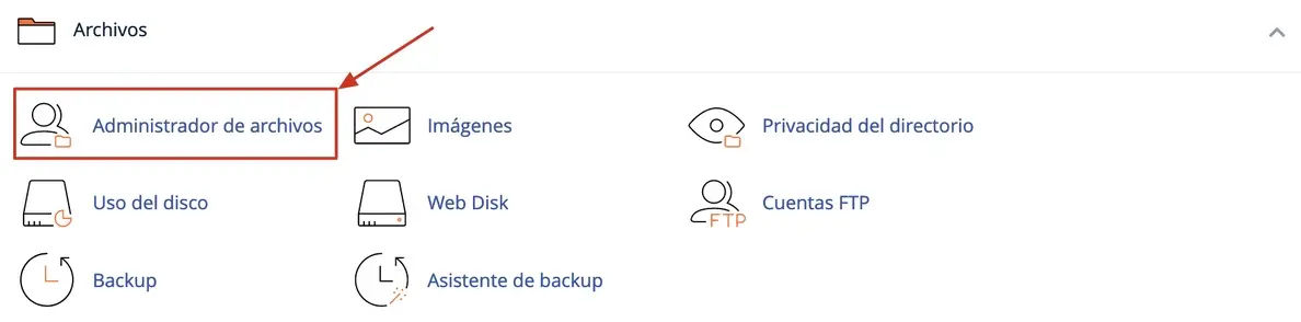 Si requerimos modificar los archivos o directorios del hosting, inicialmente debemos acceder a cPanel; donde ubicamos la sección Archivos y damos clic en Administrador de archivos: