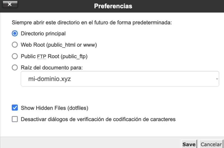 Podemos acceder directamente al administrador de archivos haciendo clic en el enlace correspondiente al dominio en Raíz del documento: