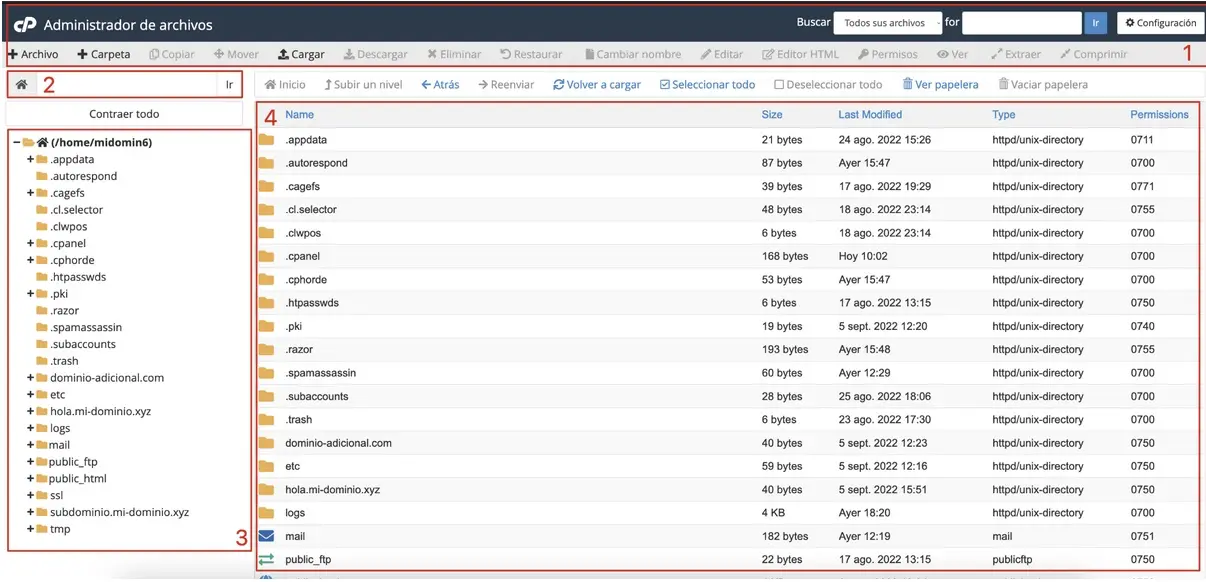 • Barra de herramientas del administrador de archivos: contiene las funciones básicas para administrar archivos: crear una carpeta, crear un archivo, copiar, mover, cargar, descargar, eliminar, restaurar o deshacer cambios, renombrar, editar, editar en formato HTML, editar permisos, extraer archivo y comprimir un archivo.