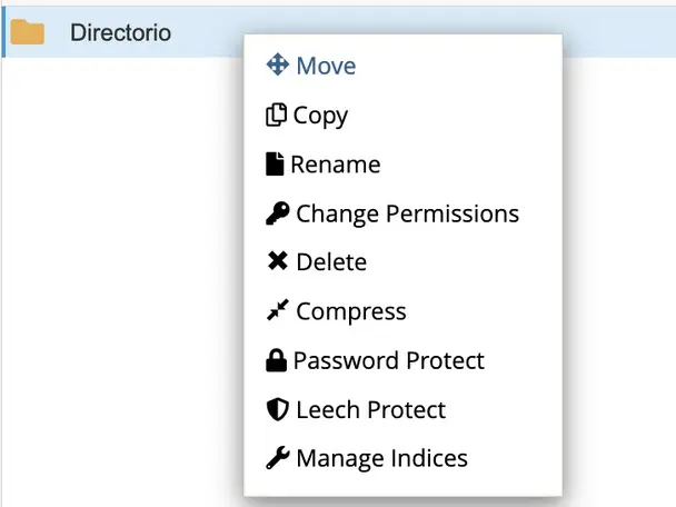 En el caso de los directorios tenemos las opciones: mover, copiar, renombrar, cambiar permisos, eliminar, comprimir, protección con contraseña, protección de carpeta y administrador de índices.