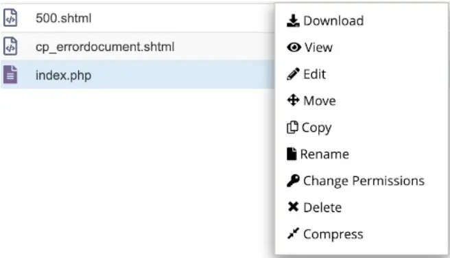 En los archivos veremos las opciones: descargar, ver, editar, mover, copiar, renombrar, cambiar permisos, eliminar y comprimir.